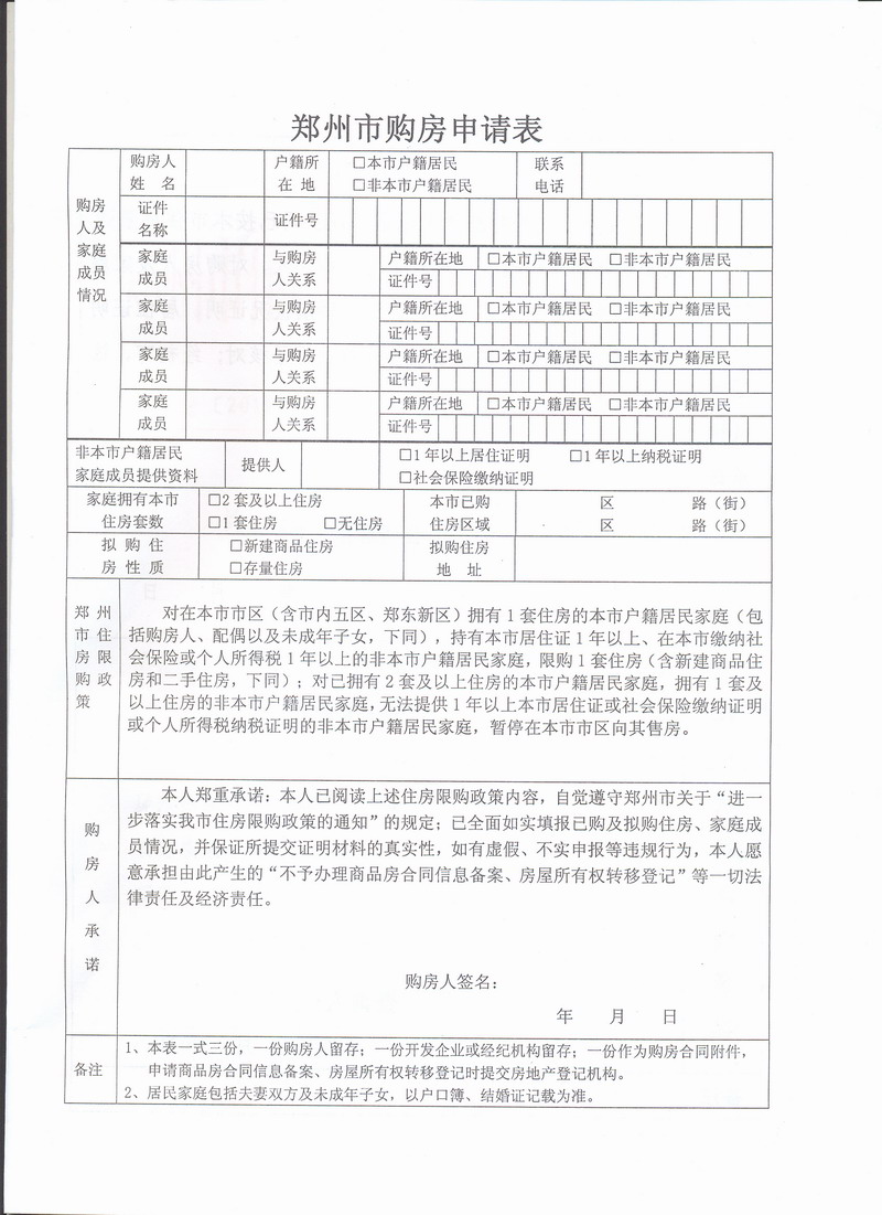 鄭州市住房限購期間購房申請表