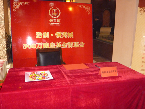 12月18日:由尚正行代理的浩創(chuàng)•領(lǐng)秀城舉辦了300萬購房基金、數(shù)百箱購房禮品齊放送活動。凡當(dāng)天大定客戶都可獲得購房基金和價值三百余元的一套禮品,當(dāng)場贈送。