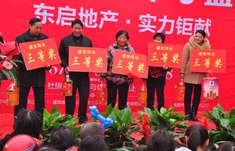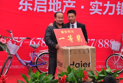 1123日上午11時,最為激動人心的還是抽獎環節開始了,本次活動設一等獎1名是洗衣一臺,二等獎2名自行車一輛,三等獎5名金龍魚食用油一桶。部分客戶喜得大獎,歡天喜地,而沒有抽到獎品的客戶,也有盛世陽光項目部為大家準備的精美禮品和1000元房源優惠大獎,當天上午到訪的近500組客戶在一片歡聲笑語中滿意而歸,為盛世陽光在社旗打開局面奠定了良好基礎,塑造樹立東啟地產的品牌知名度和美譽度。