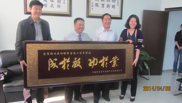 河南省尚正行房地產咨詢有限公司有幸與合作伙伴鄭州成功財經學院共同慶祝成立十周年,和成功學院合作五年來,學院每年都為我司輸送幾十名優秀人才,至此已經有近百名成功學院學子在我司任職,其中擔任公司要職的也大有人在,介于與成功學院的友好合作,在成功學院舉行十周年慶之際,我司代表副總王宏偉,人事總監凌云英及成功學院在我司代表一行前往學院祝賀,并送去我司對學院的美好祝愿以及感謝,希望學院宏圖大展、越辦越好,也希望我們的合作能夠繼續順利,共同為社會作出自己的貢獻!