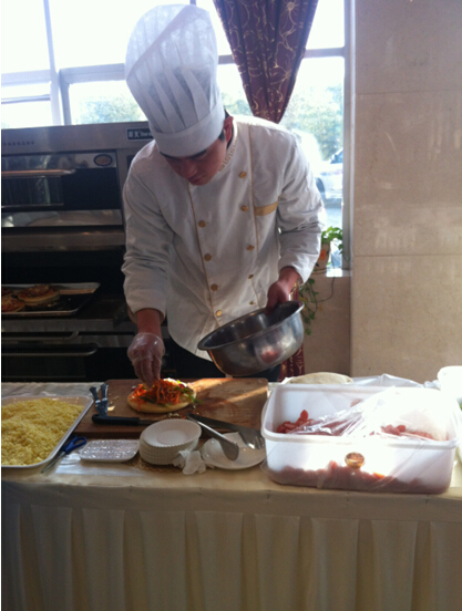 受邀客戶們認(rèn)真觀看披薩師傅的示范,仔細(xì)學(xué)習(xí)制作工藝和需要注意的方面。拌好配料,仔細(xì)均勻的撒在披薩面皮上。接下來披薩師傅將已經(jīng)準(zhǔn)備好的碎芝士撒勻,要注意芝士的量不能過多,否則就會很膩,也不能太少,這樣會烤糊,同時(shí)一定要注意要撒均勻,不然烤好之后是不會拉絲的。