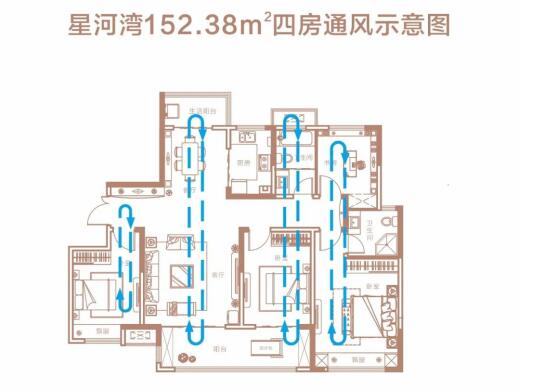 我們可以看到星河灣152.38㎡四房,南北通透,南向面寬大,而且進(jìn)深短,開窗條件下基本可以實(shí)現(xiàn)無死角空氣對流,室內(nèi)時刻保持空氣換新。