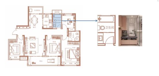 三段式空間,功能分區(qū)清晰,保持干濕分離,洗漱、如廁、沐浴功能互不干擾,家人間的日常盥洗井然有序。