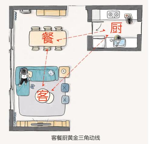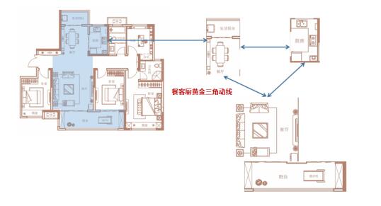 同時家庭公共活動空間形成“黃金三角”區(qū)域,客廳作為全家人共聚的場所,是一個家的核心,而餐廳是一家人坐下來好好吃飯的場所,是家人難得的團(tuán)聚。客餐廚的完美互動關(guān)系,正是對一家人最美好的詮釋。